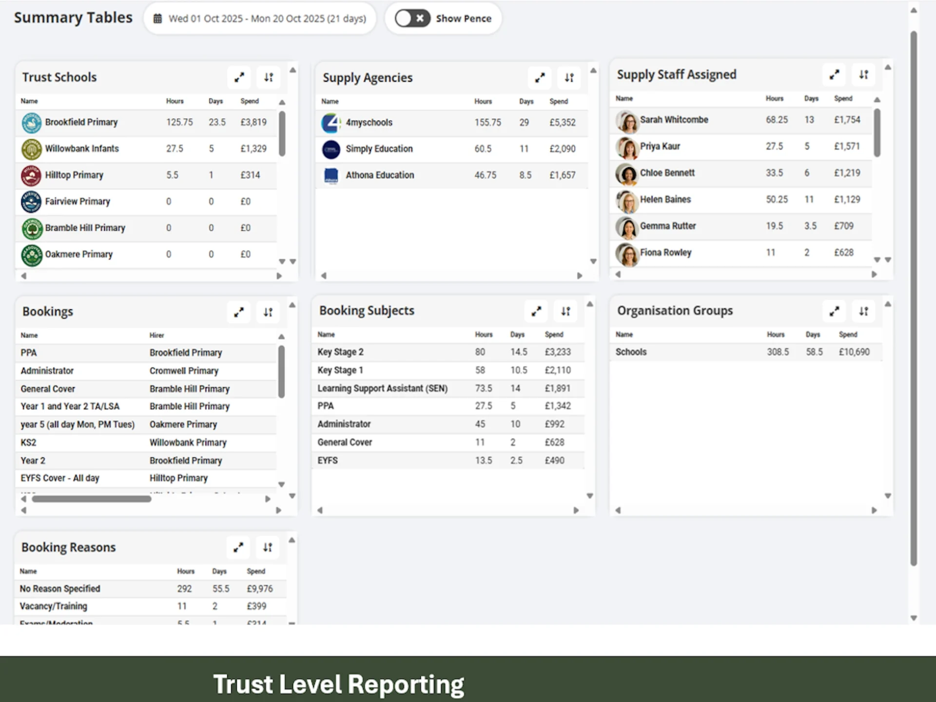 Track schools supply staff spend in real time, reasons for supply, subjects, durations and much more