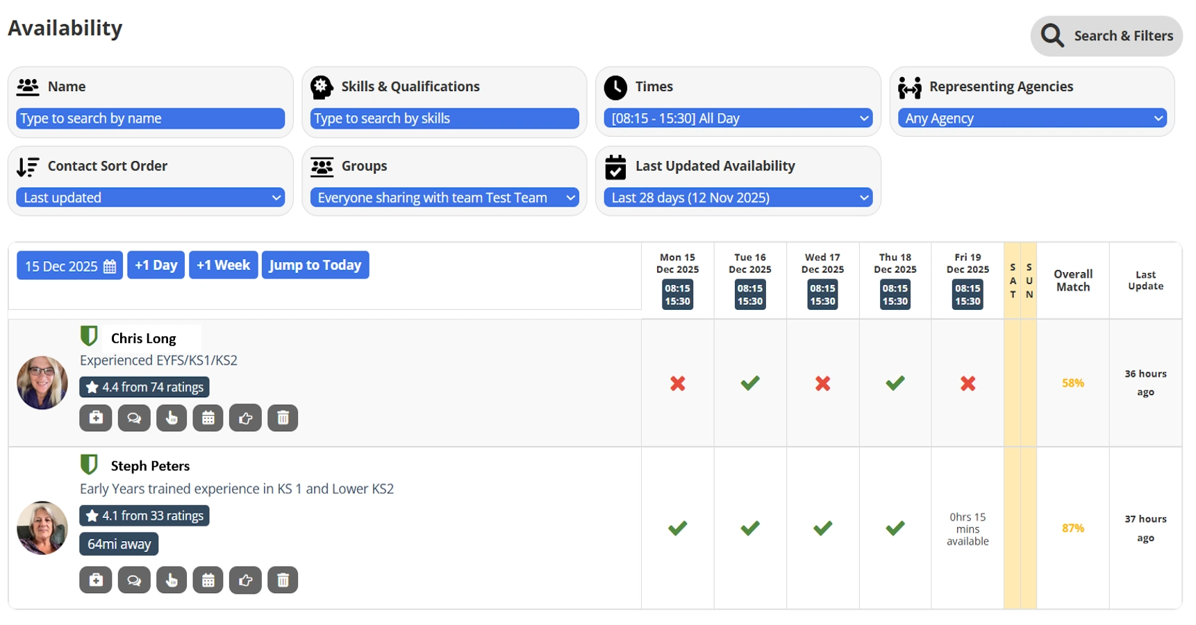 See each contacts latest availability, and when they last updated it. Send cover bookings to individuals, or send to multiple contacts, 24/7.